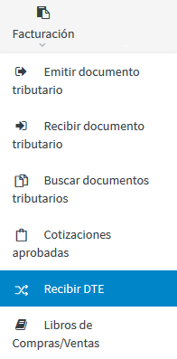 Cuando se recibe una factura electrónica u otro DTE, a su casilla de intercambio debería llegar un correo que contiene el sobre DTE, que es un archivo en formato XML, con la información del DTE recibido. Tanto para cargar los datos del DTE en Facto, como para generar la respuesta comercial a este documento, se debe acceder a la opción Facturación -> Recibir DTE: