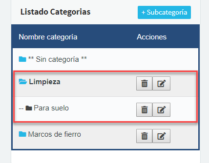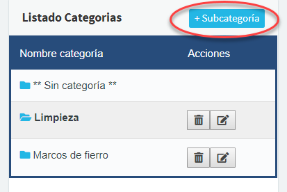 Para agregar una subcategoría, debemos hacer click en el nombre de la categoría a la que queremos agregarle una subcategoría, en este caso, haremos click en Limpieza, automáticamente el botón que era para +Categoría pasará a ser +Subcategoría: