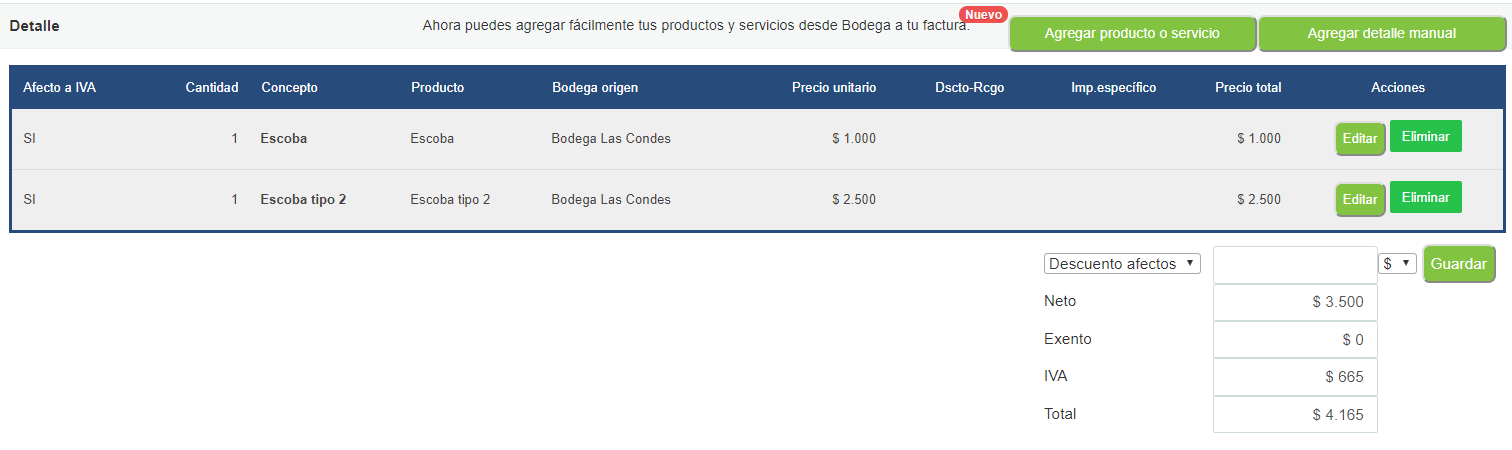 Al emitir un documento tributario de venta (facturas, boletas, etc.) o un documento de uso interno, como el Registro interno disminuye stock (nota de gasto), tendremos que manejar la asignación de stock en el detalle del documento, para eso usaremos el botón de Agregar producto o servicio, a medida que vamos agregando detalle al documento, se verá una lista como la siguiente: